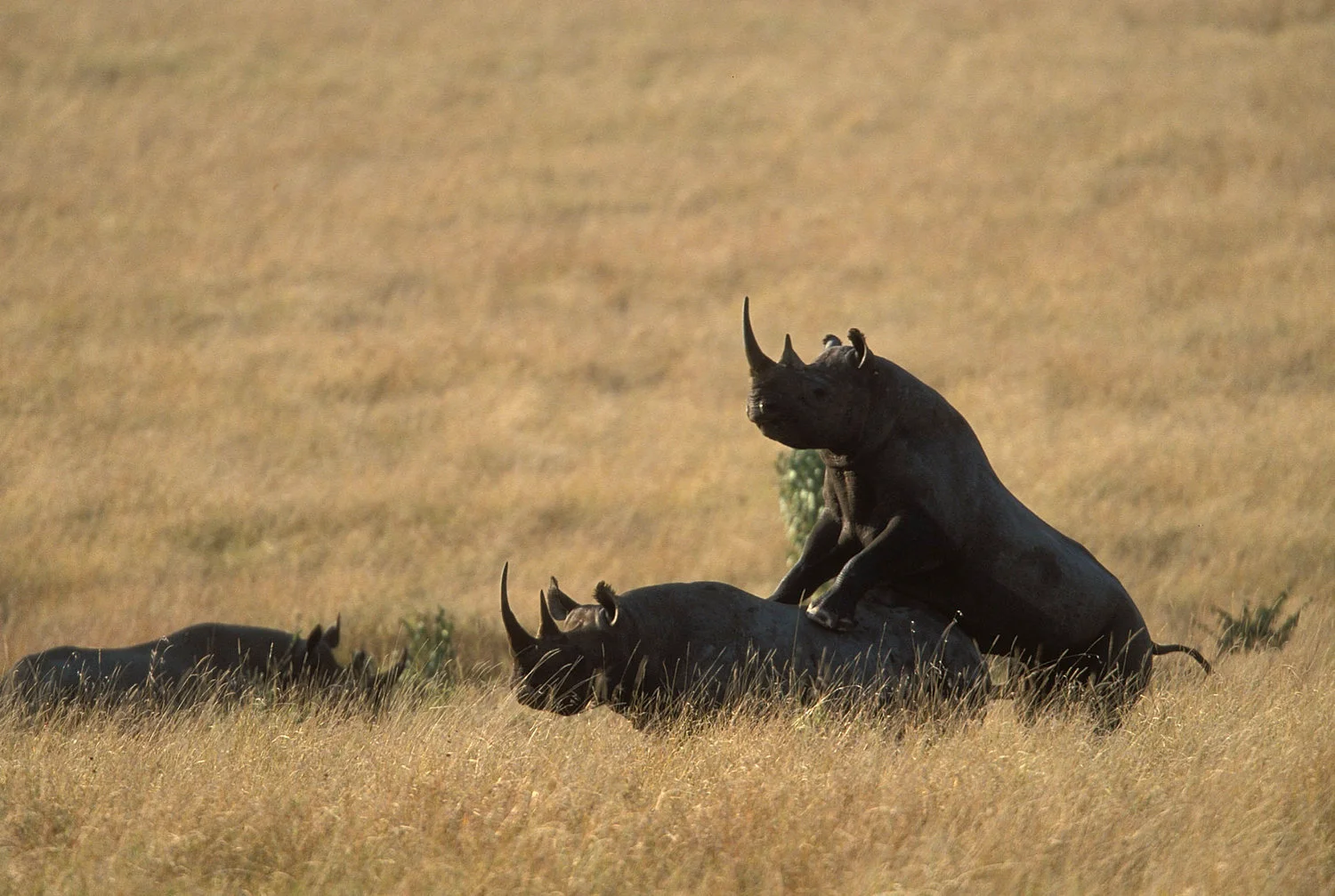 Black rhinos are generally solitary creatures, with the strongest bond existing between a mother and her calf. These majestic animals have home ranges that sometimes overlap, meaning they might share feeding grounds, wallows, and water holes with other rhinos. As browsers, black rhinos use their uniquely shaped upper lip, which is triangular and ends in a grasping point, to munch on a variety of vegetation. This includes leaves, buds, and shoots from plants, bushes, and trees. There is a great black rhino population in Masai Mara, these elusive black rhinos are a fascinating sight, embodying the wild beauty of the Maasai Mara National Reserve.